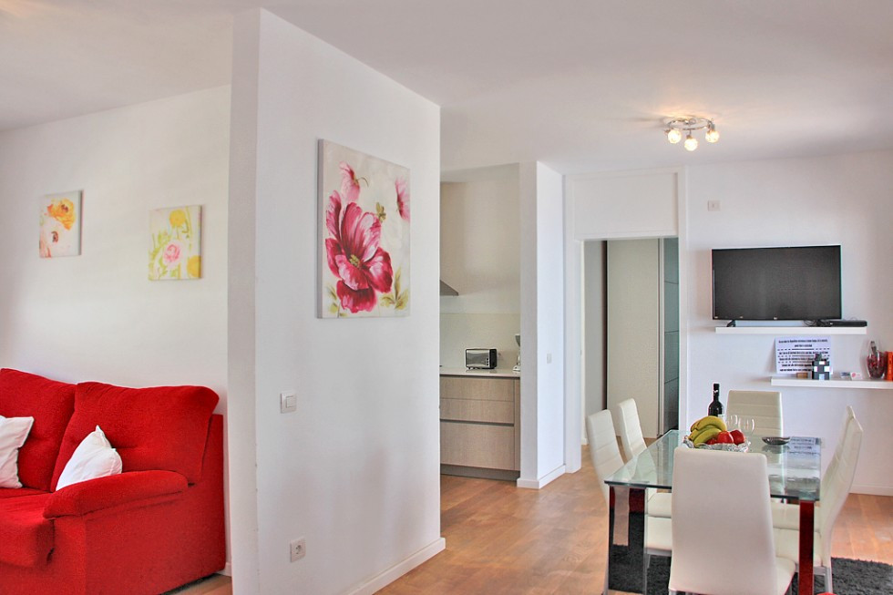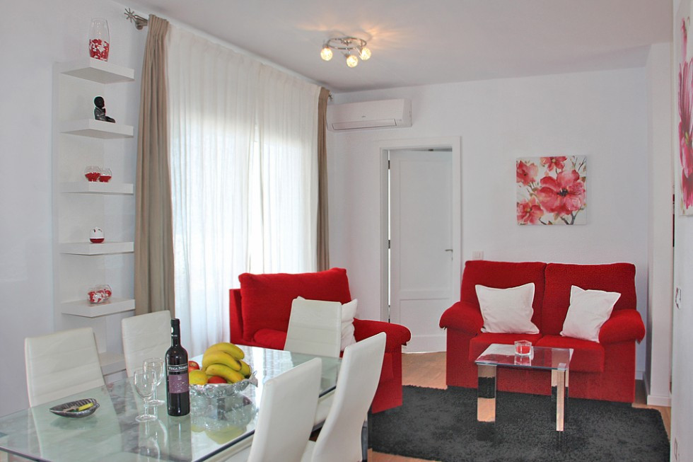 Der Raum ist sehr offen und luftig gestaltet, von ihm gelangt man zum einen in die sehr gut ausgestattete Küche und zum anderen in einen Vorraum. Hier steht ein Schlafsofa welches bei Bedarf genutzt werden kann. Über den Vorraum gelangt man in das Bad mit Badewanne und WC. Der Wohnbereich selbst wird farblich durch zwei rote Sofas aufgewertet.