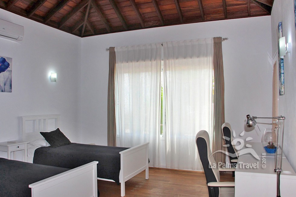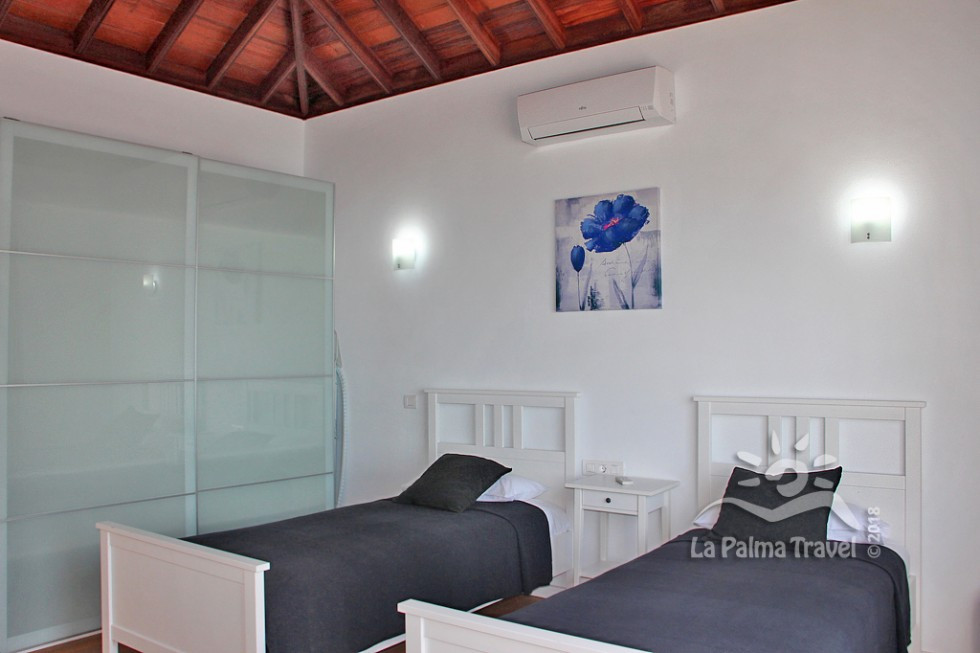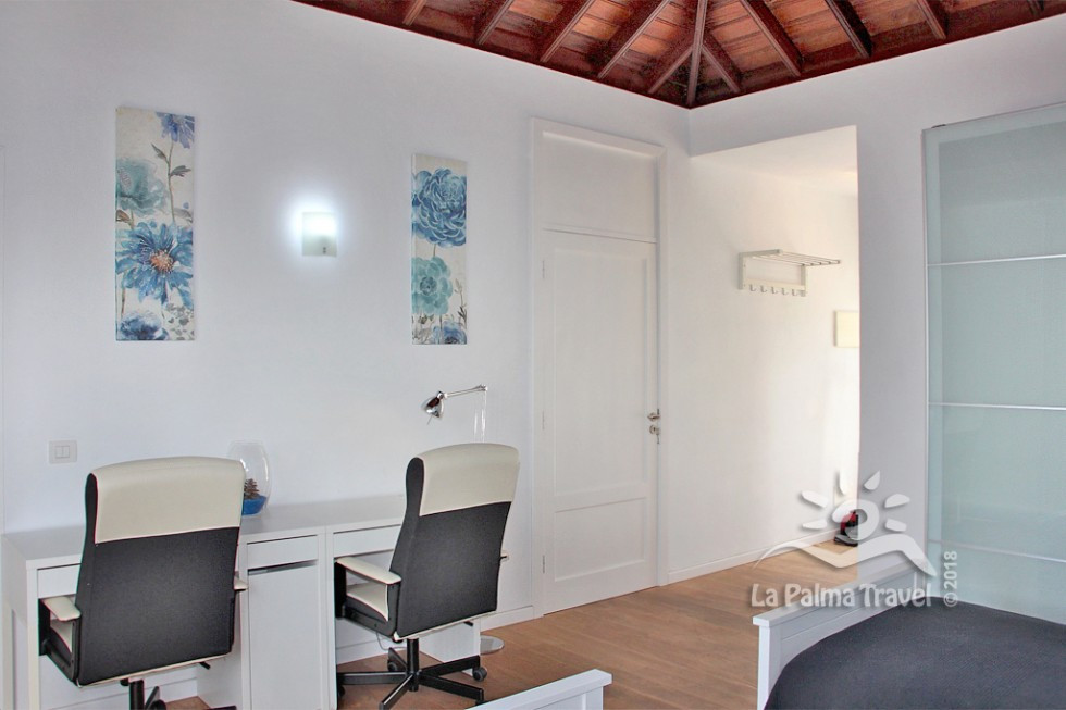 Das größere von beiden Schlafzimmern mit zwei Einzelbetten bietet einen großen Schreibtisch und ist mit einem Ensuite Bad mit Dusche + WC verbunden. Das zweite Schlafzimmer mit Doppelbett befindet sich auf der anderen Seite des Wohnbereiches.