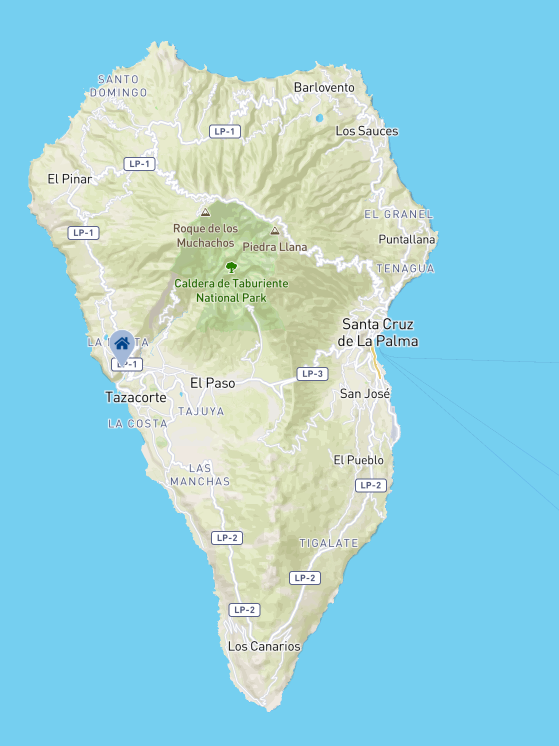 Die Villa La Planta liegt auf rund 550 Höhenmetern an der sonnigen Westseite La Palmas – dem perfekten Ausgangspunkt für Wanderungen und Ausflüge. Der beliebte Mirador del Time ist ganz in der Nähe, ebenso zahlreiche Wanderwege und der Strand von Puerto de Tazacorte (ca. 15–20 Autominuten entfernt).