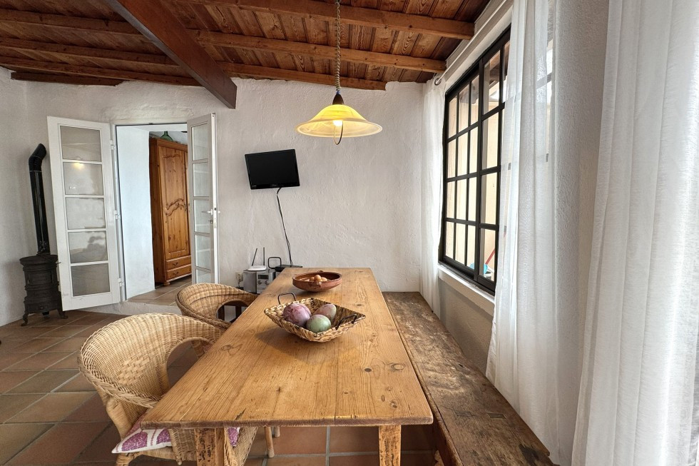 Bereits beim Betreten öffnet sich der große Wohnraum wie eine umarmende Geste: warme Holztöne, liebevolle Details, ein Esstisch aus robustem Holz, Korbstühle, ein Sofa, auf dem man Stunden verbringen könnte – lesend, träumend, plaudernd. Das helle Holzdach verleiht dem Raum eine warme, weiche Atmosphäre, die sich sofort über das Gemüt legt.
