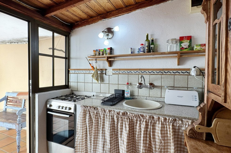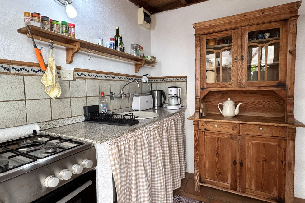 Die kleine, separate Küche ist zwar kompakt, aber liebevoll gestaltet und gut ausgestattet. Ein Gasherd, Backofen, schöne Holzvitrine für Geschirr und Utensilien – perfekt für ein mediterranes Abendessen oder einen Kaffee beim ersten Licht des Tages.