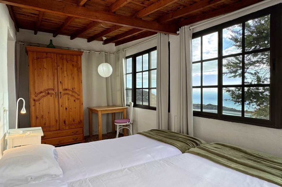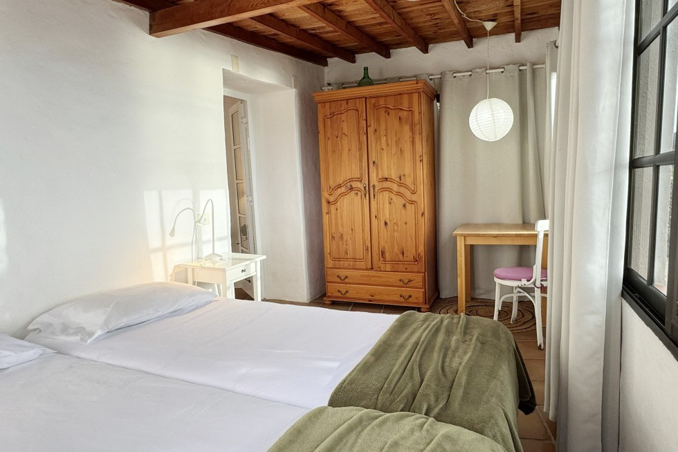 Das Schlafzimmer ist ein Ort der Stille. Die Fenstergalerie eröffnet Ihnen schon beim Erwachen den Blick auf die Weite des Ozeans, auf die sanften Hügel der Cumbre Vieja, auf das Licht, das im Laufe des Tages wie ein Künstler mit Farben spielt. Ein tiefes Einatmen – und Sie spüren: Hier beginnt der Tag anders. Weicher. Langsamer. Bewusster.