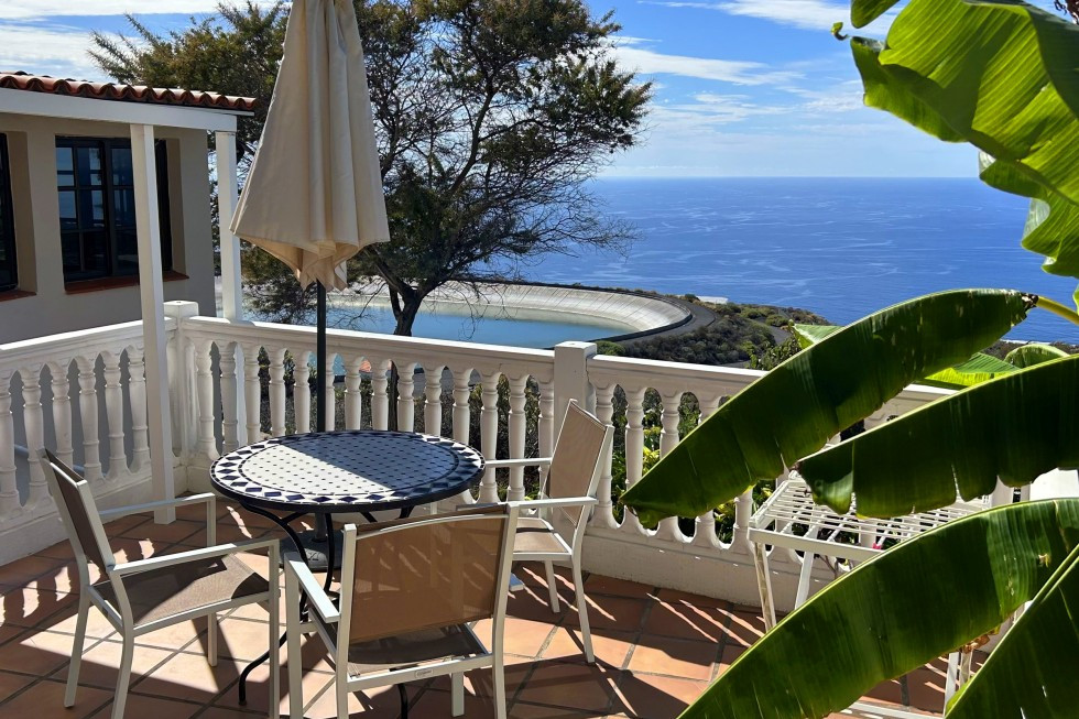Hier hören Sie nichts außer dem leisen Rauschen des Windes in den Palmen, dem Schmettern der Vögel und abends dem sanften Summen der Natur. Die Aussicht reicht über ein grünes Tal, die bewachsenen Flanken des Vulkanrückens und natürlich über das weite Blau des Atlantiks.