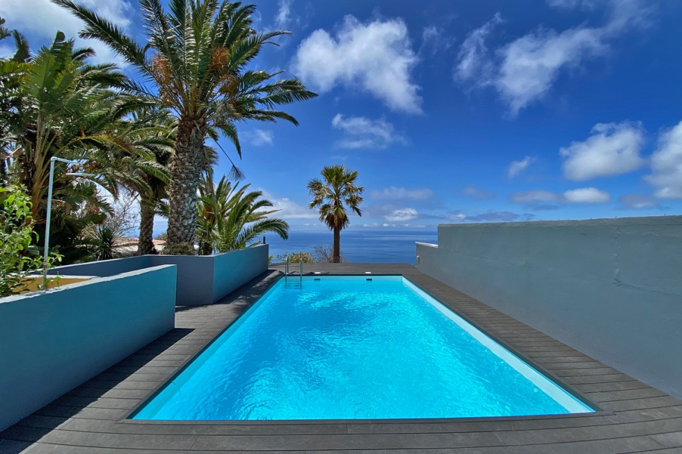 Der beheizbare Gemeinschaftspool (Salzwasser, 6 × 4 m) ist ein stiller Ort auf der Finca, eingerahmt von Natur und Himmel. Ob frühmorgens beim sanften Schwimmen oder abends unter dem Sternenhimmel von La Palma – dieser Pool ist ein Ort, an dem man die Welt vergisst.