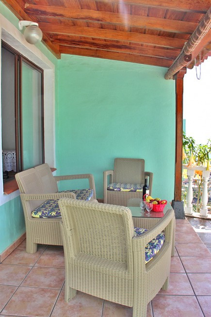 Die kleine private, teilüberdachte Terrasse bietet wie bei den anderen Häusern einen freien schönen Blick auf das Meer.