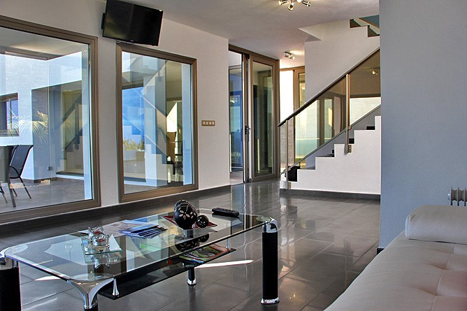 The 150 m² villa is spread over two levels and is perfectly nestled into the hillside, ensuring privacy and fantastic views. The upper floor is accessible directly from the street-level parking. Both floors are also connected by an internal staircase.