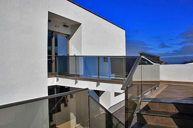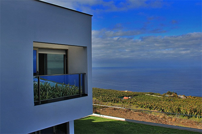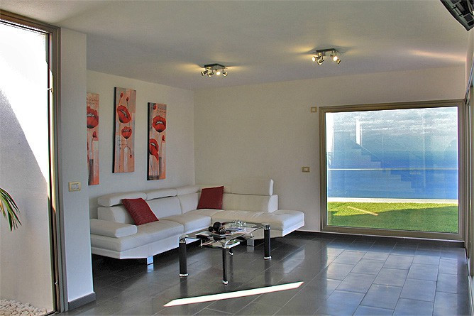 - Open-plan living area with white leather sofa, floor-to-ceiling glass, and unobstructed views over the Atlantic