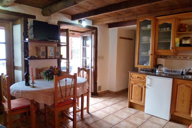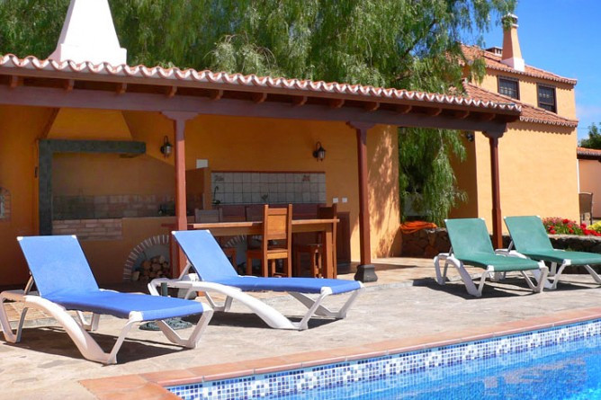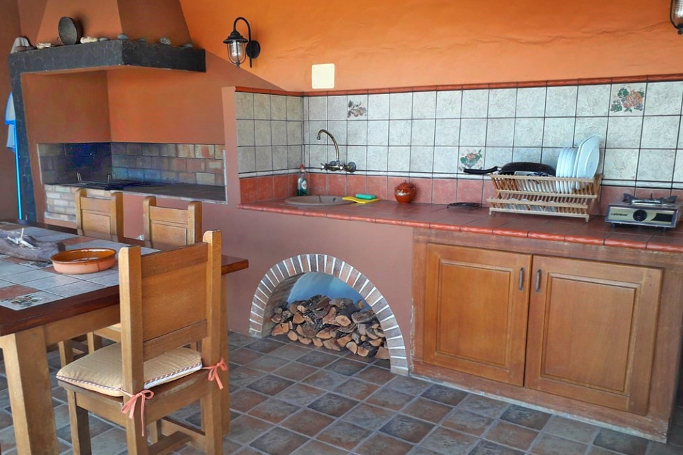 - The living/dining room is cozy and inviting with a two-seater sofa, rattan armchair, wood-burning stove and Canary-style wood ceiling.