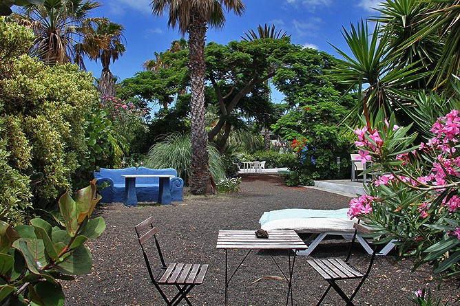 Eine gemauerte, leuchtend blaue Gartenbank ist ein Farbtupfer und ein netter Aufenthaltsort zugleich